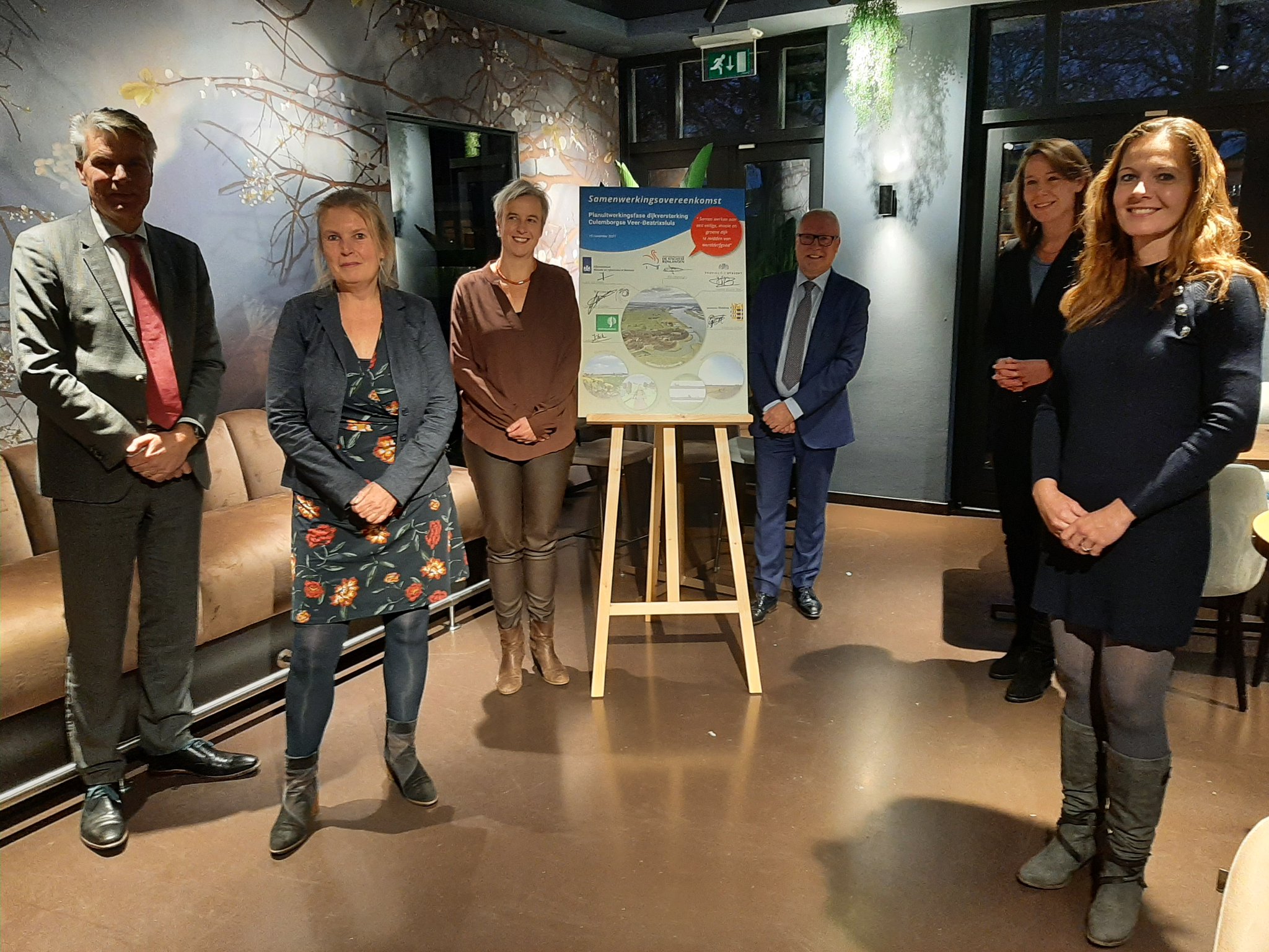 Van links naar rechts op de foto: De ondertekenaars: Jos van Hees (RWS), Jelka Both (Staatsbosbeheer), Els Otterman (Hoogheemraadschap De Stichtse Rijnlanden), John van Engelen (gemeente Nieuwegein), Hanke Bruins Slot (Provincie Utrecht) en Hilde de Groot (gemeente Houten)