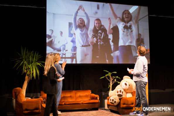 Fotobijschrift: PortoMini is Junior Company van het Jaar 2020 (havo/vwo) en viert dit met veel confetti. Op het podium staan dagvoorzitter Ingrid Jansen, juryvoorzitter havo/vwo Thomas Blekman en directeur van Jong Ondernemen Mariolein van der Plas. Foto: Eva Leget