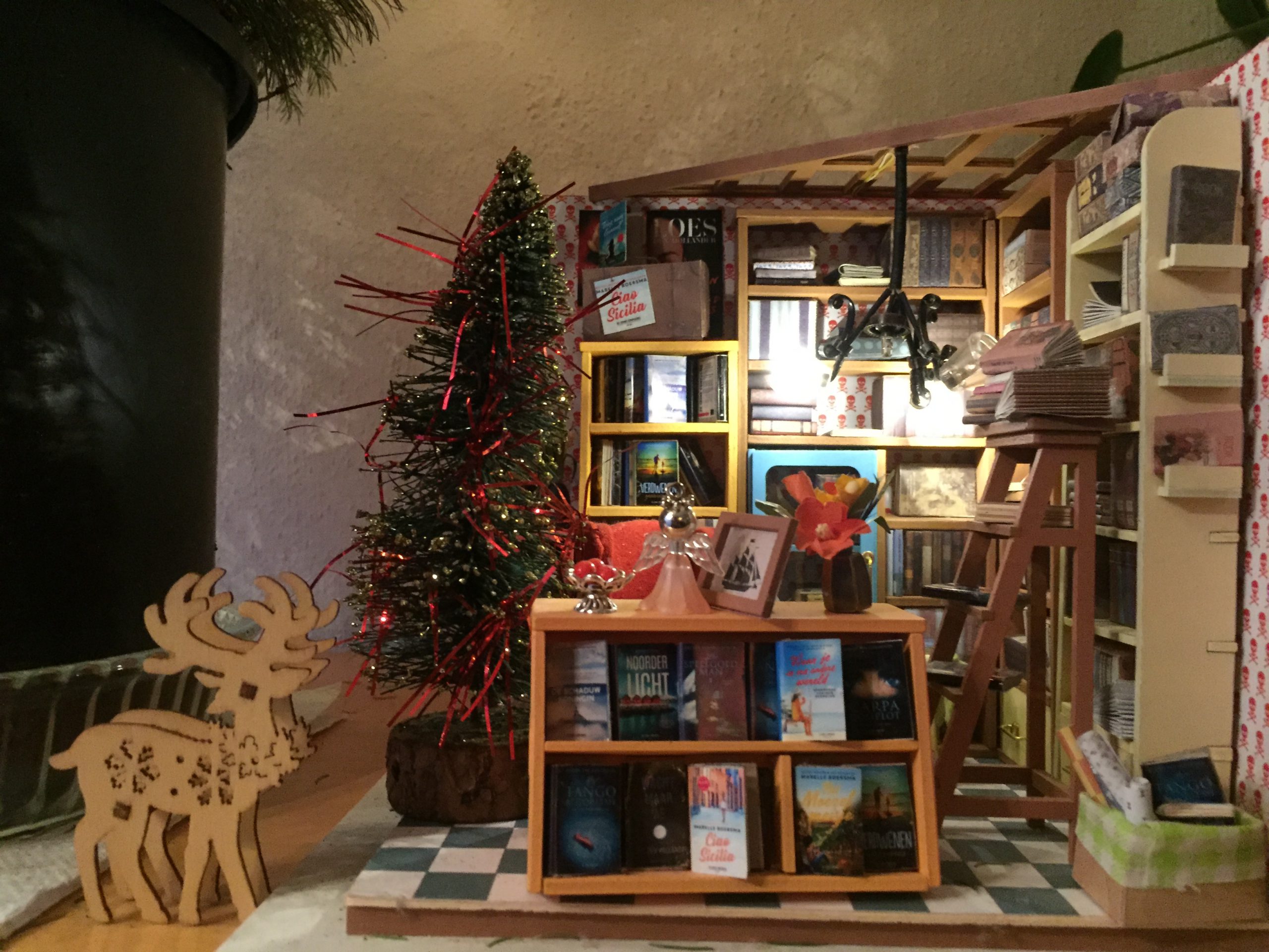‘Dus steek ik de lampjes aan in het mini-boekwinkeltje onder mijn kerstboom en wens ik alle lezers een mooi en gelukkig kerstfeest met veel licht en dankbaarheid voor wat mooi is en goed.’