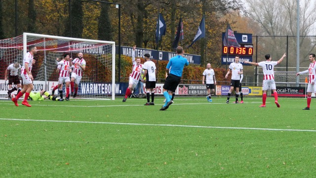 Al na anderhalve minuut kon Geinoord juichen in de derby tegen JSV. Een hoekschop van Luc Venneboer Jansen vliegt rechtstreeks in het doel van de bezoekers: 1-0. (foto Gerard van Vliet)