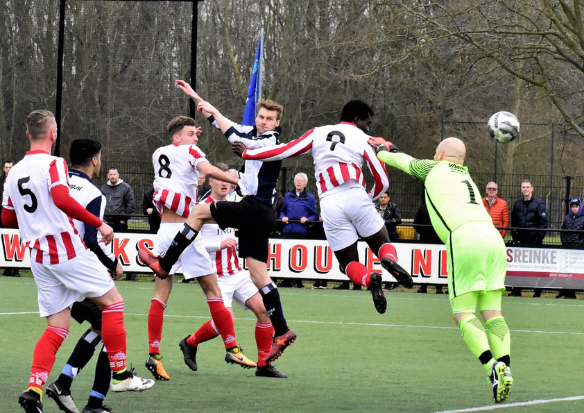 De 1-0 van Geinoord tegen Victoria in beeld. Dimitri Djollo kopt de bal achter de mistastende doelman Rik Letteboer. (foto Gerard van Vliet)