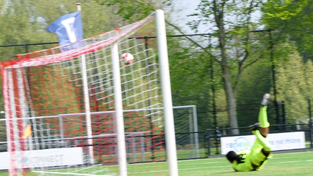 Doelman Giordano van der Pol strekt zich vergeefs naar het fraaie schot van Timo Meerding in de verste hoek, Geinoord leidt al na drie minuten met 1-0 en zou met deze cijfers winnen (Foto: Gerard van Vliet)