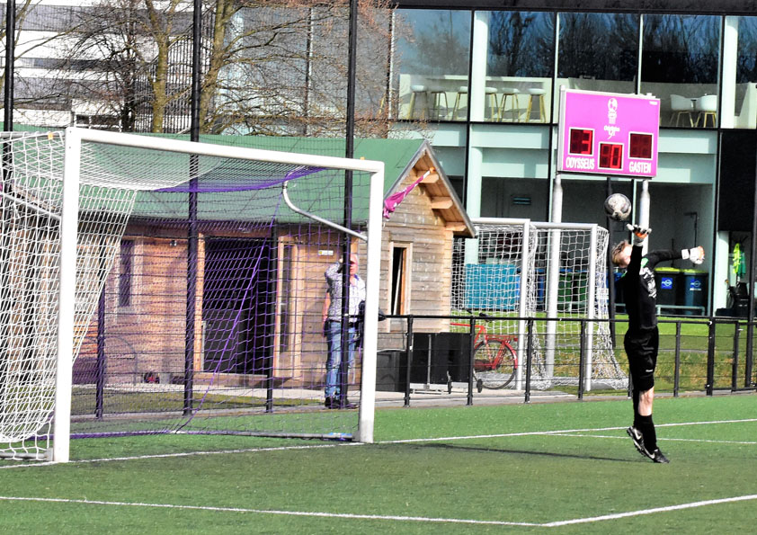 De doelman van Odysseus tast mis op de fraaie treffer van Daniël Makkee (foto Gerard van Vliet)