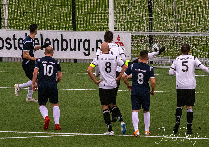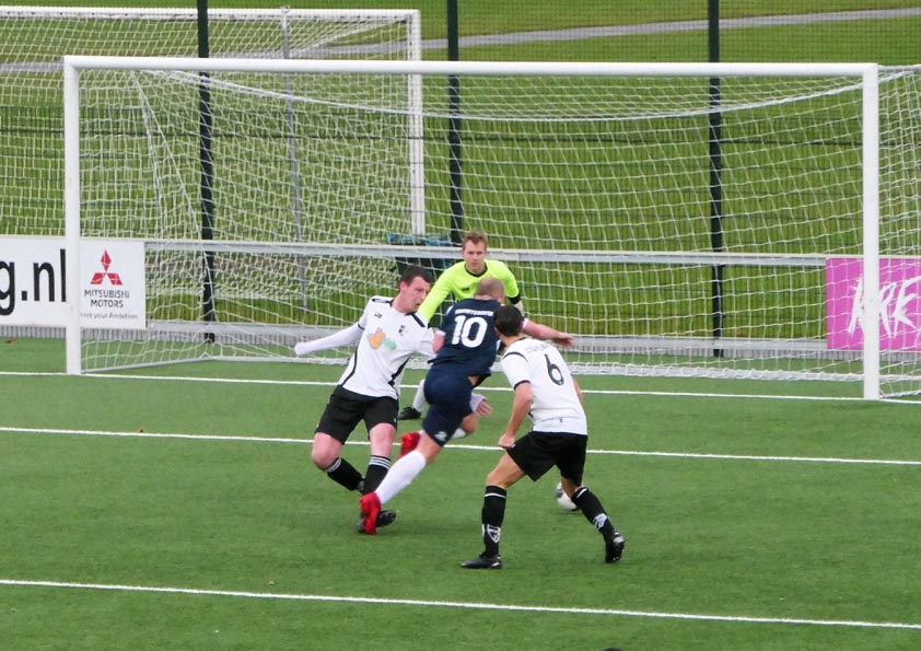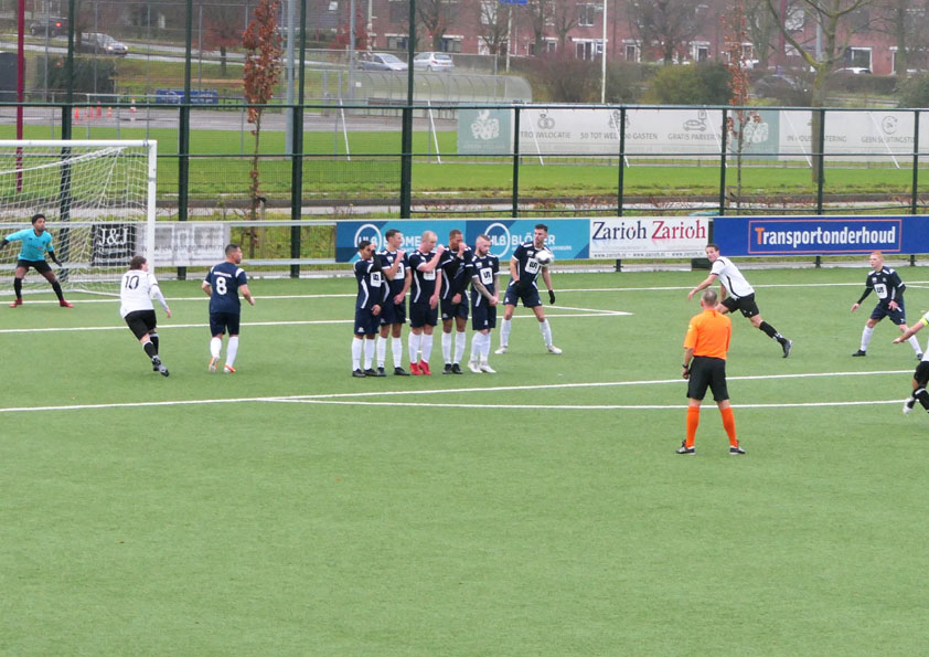 Oud-Geinoorder Michiel van der Valk schiet een vrije trap binnen brengt de strandopgang 1-2, doelman Gordiano van der Pol is kansloos (Foto: Gerard van Vliet)
