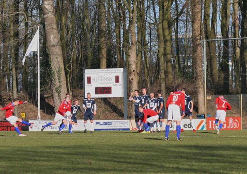 Foto: De 1-0 in de maak voor Breukhoven van VVGZ in de achtste minut vanuit een vrije trap.