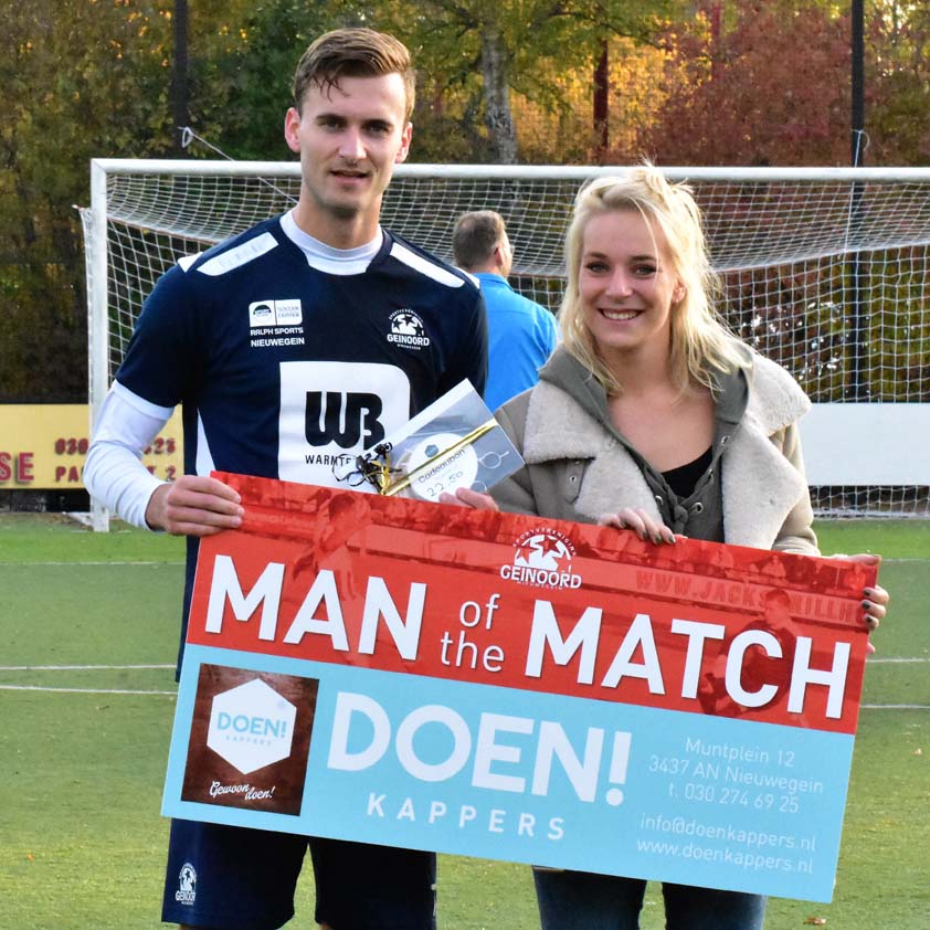 ‘Man of the match’ werd overigens aanvaller Robert Maat met twee treffer en een assist waardoor hij na afloop op de foto mocht en zijn cadeau in ontvangst kon nemen. Niet alleen zijn inbreng was belangrijk, de collectieve prestatie van Geinoord deed de aanhang deugd. De weer onder de lat teruggekeerde Gino de Ridder had ook zijn aandeel met een aantal puike reddingen, al leidde een fout van hem toch nog de spannende slotfase in, toen hij bij zijn uittrap de bal via de rug van een speler geblokkeerd zag worden hetgeen de inleiding was voor een tegengoal.