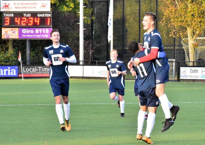 Zojuist heeft invaller Sem van Zwieten (nr 13) de achteraf beslissende vierde treffer voor geinoord gescoord, hij wordt juichend opgevangen door teamgenoot Timo Meerding terwijl links Robert Maat die de assist gaf, komt aanrennen. (foto Gerard van Vliet)
