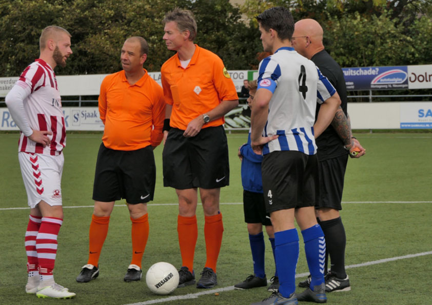 IJFC en Geinoord bij de aftrap van de streekderby, samen met scheidsrechter Tony van Wavderen. De thuisclub zou met 2-0 zegevieren (foto: Gerard van Vliet)