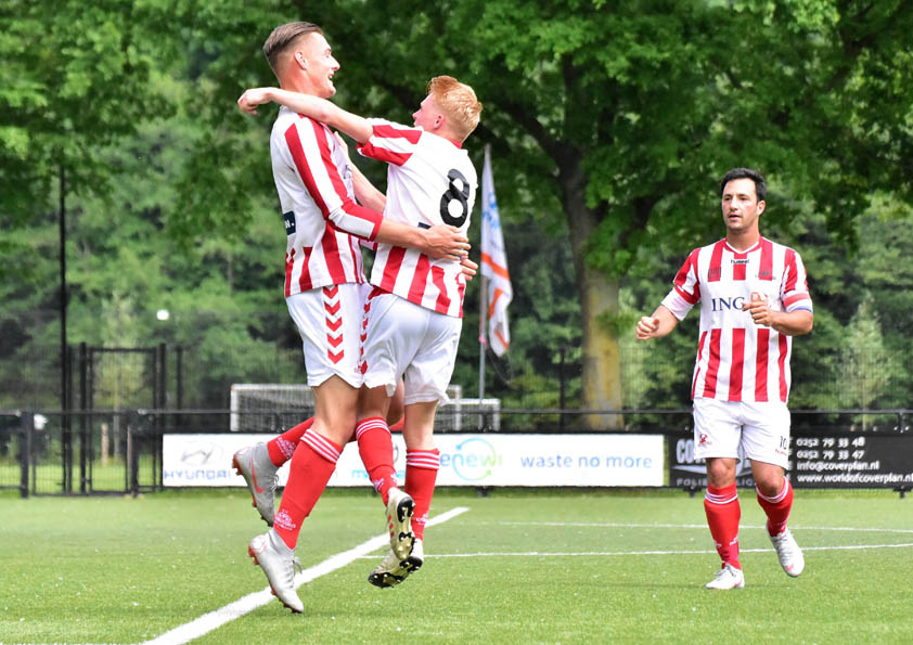 Juichende spelers bij Geinoord, doelpuntenmaker Sem van Zwieten wordt omarmd door teamgenoot Robin Kuyer. Beide spelers beginnen zaterdag aan de nacompetitie tegen De Pelikaan (foto Gerard van Vliet)
