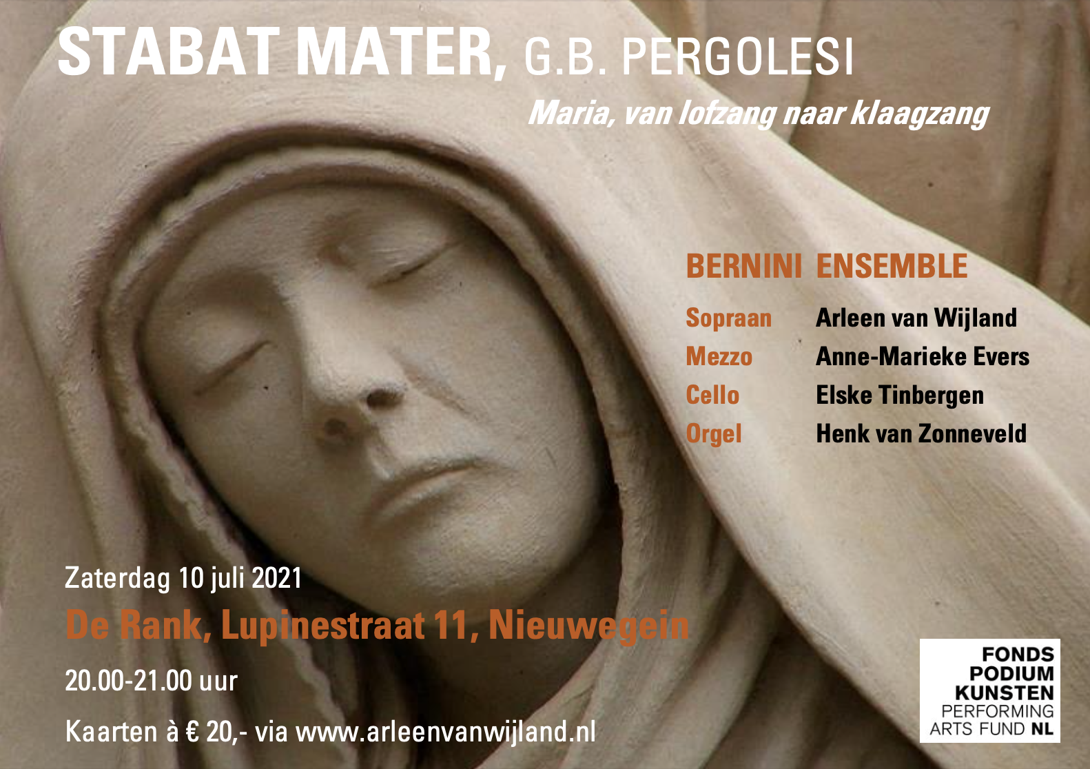 Op zaterdagavond 10 juli aanstaande wordt er een bijzonder concert gegeven in de grote zaal van de Rank in Nieuwegein. Het Bernini Ensemble, bestaande uit Arleen van Wijland (sopraan), Anne-Marieke Evers (mezzosopraan), Elske Tinbergen (cello) en Henk van Zonneveld (kistorgel) zullen die avond het prachtige en bekende Stabat Mater van Pergolesi uitvoeren.