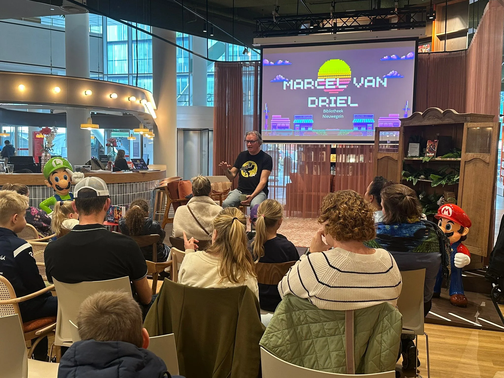Het Kinderboekenweekfeest was de feestelijke afsluiter van een week vol activiteiten, waaronder een voorleesfeestje, lasergamen en een tekenworkshop. Toch was er nog één klapper op de agenda: auteur Marcel van Driel, bekend van de populaire boekenreeks Game Helden, bezocht zaterdag 11 oktober het Stadshuis. Daar vertelde hij over zijn boeken aan een zaal vol nieuwsgierige kinderen én ouders.
