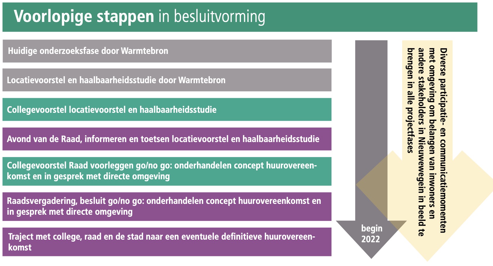 “Om alle belangen in alle fases van het project goed mee te nemen, zullen er komend jaar veel verschillende momenten zijn voor en met inwoners om in gesprek te gaan met de gemeente en Warmtebron. Uiteraard hoort daarbij een passend communicatietraject om iedereen tijdig van de juiste informatie te voorzien over de inhoud en over de voortgang van het totale (participatie-)proces. Op basis van een afweging van alle in beeld gebracht belangen, kansen en risico’s zal het college en uiteindelijk de gemeenteraad een besluit moeten nemen.”