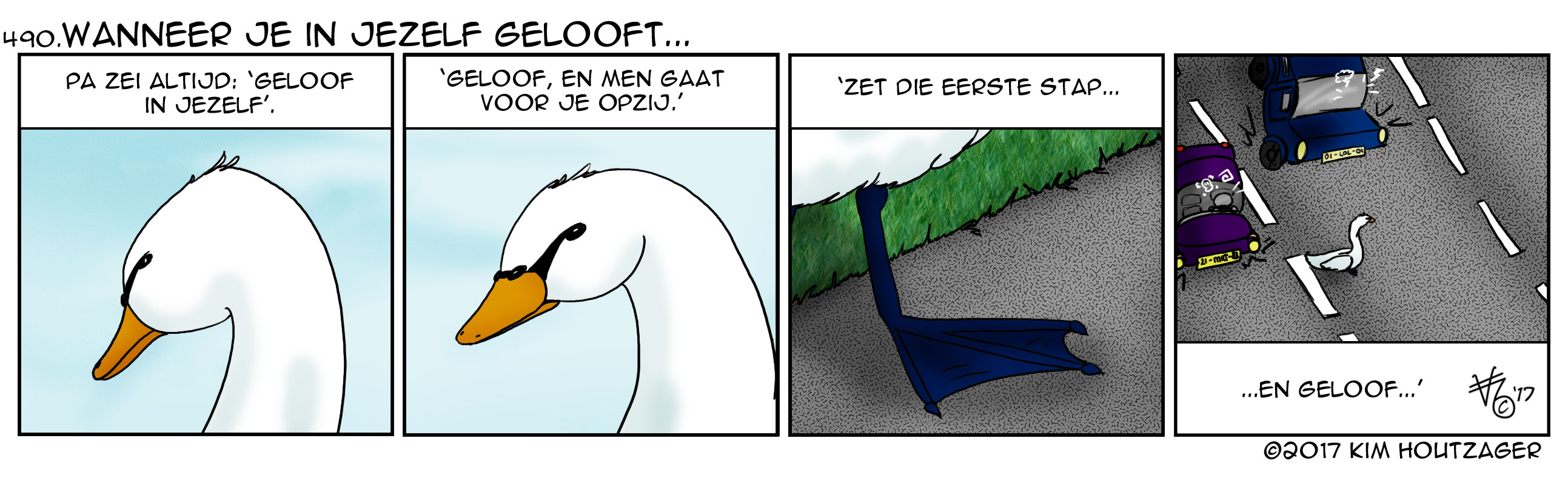 Kim: ‘Soms kom je een heel eind, als je maar gelooft. Het zetten van de eerste stap is altijd de moeilijkste, maar als je eenmaal gaat, moet je doorzetten. Dat moet een zekere zwaan ook hebben gedacht. Nu is een zwaan een stevige vogel, en een botsing doet zwaan en auto weinig goeds, dus het was niet verwonderlijk dat er enkele banen afgezet worden. Maar, de vraag blijft: waarom stak de zwaan de weg over?‘
