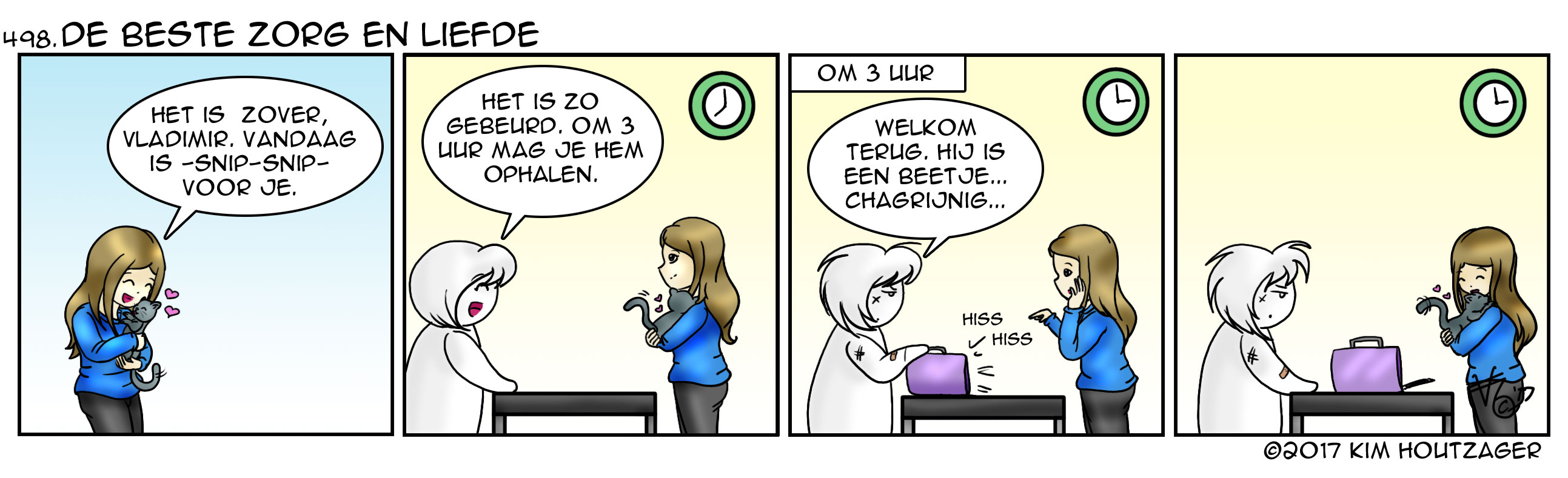 Kim: ‘Voor vele katers komt de dag: de castratie. Een kleine ingreep wat niet alleen ongewenst gedrag (sproeien) kan voorkomen, maar ook ongewenste nestjes. Voor onze kleine kater was het moment dan ook daar. Het leek wel alsof hij het voorvoelde, want hij was niet echt netjes tegen de dierenarts. “Pas op, hij kan wat chagrijnig zijn!” werd ik gewaarschuwd, maar… niet tegen mij. Nu stuitert onze Vladimir al weer door het huis, alsof er niets gebeurd is. Fijn, dat hij door de kunde van de dierenarts er zo weinig last van heeft (gehad). ‘