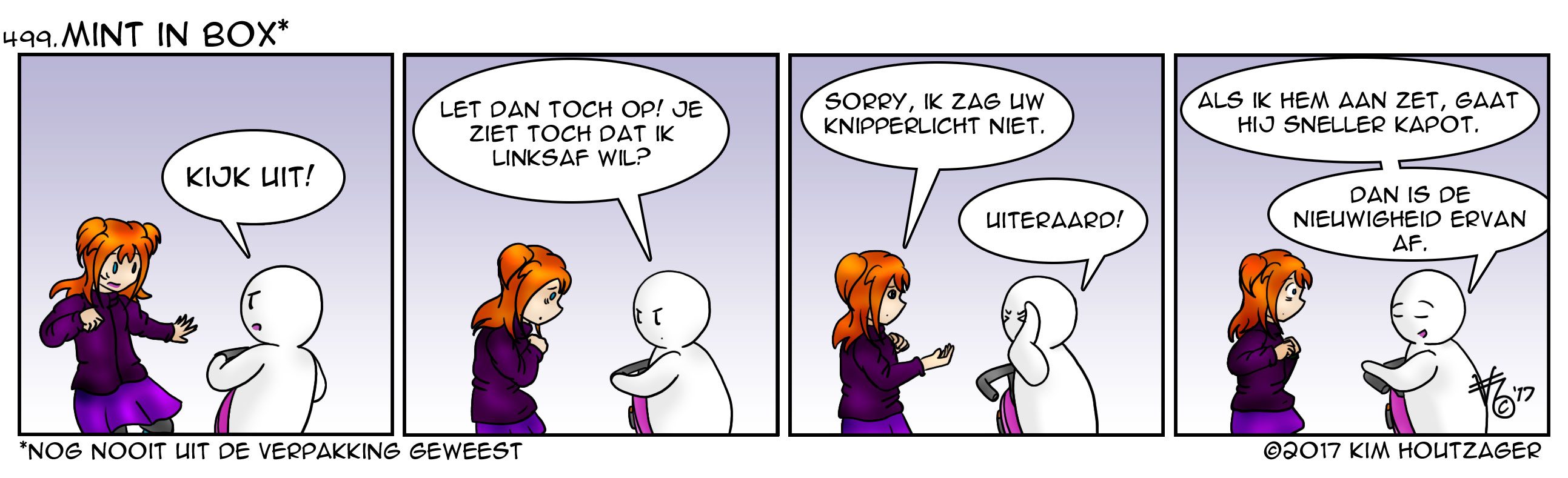 Kim: ‘Ik heb het geprobeerd, maar het lukt me nog niet de gedachten van andere mensen te lezen. Ik heb zelfs geprobeerd een glazen bol te bestellen, maar de levertijd is erg onzeker. En de hele cursus tovenaar, duurt 125 jaar…. Ik heb toch echt de hulp van mensen nodig. Bij het afslaan zou een hand of een knipperlicht erg welkom zijn. Niet alleen voor mij hoor, het schijnt dat meer mensen dit op prijs zouden stellen.’