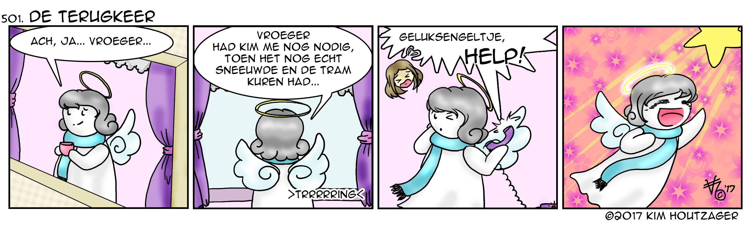 Kim: ‘Gisteren en vandaag moest ik de hulp inroepen van een oude bekende: mijn geluksengeltje. Lang heb ik haar niet nodig gehad, maar met deze sneeuw moesten alle zeilen bijgezet worden. En… het is gelukt! Geen valpartijen, tram reed lekker door en de vertraging minimaal. Geluksengeltje… bedankt! Hopelijk heb je ook de tijd gehad andere mensen te helpen.’