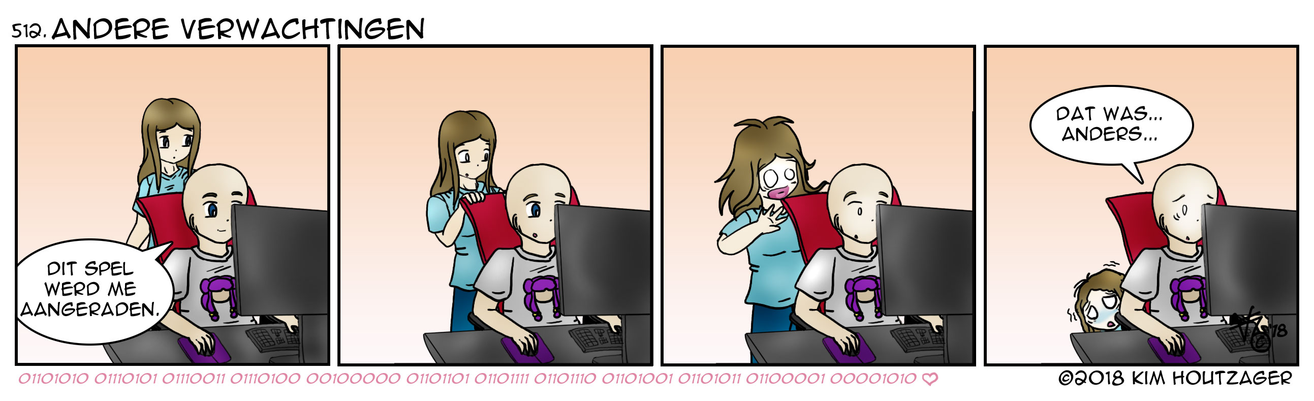 Kim: ‘Ik ben met een gamer getrouwd en stiekem ben ik ook wel een beetje een gamer. Ik vind het ook fijn om te kijken, in plaats van te spelen. Dus toen mijn man een nieuw spel ging spelen, ben ik gaan meekijken. Ik moet zeggen… van bepaalde spellen houd ik niet. En hoe schatting en lief dit ook aan het begin leek… dat was het dus niet. Verre van….’