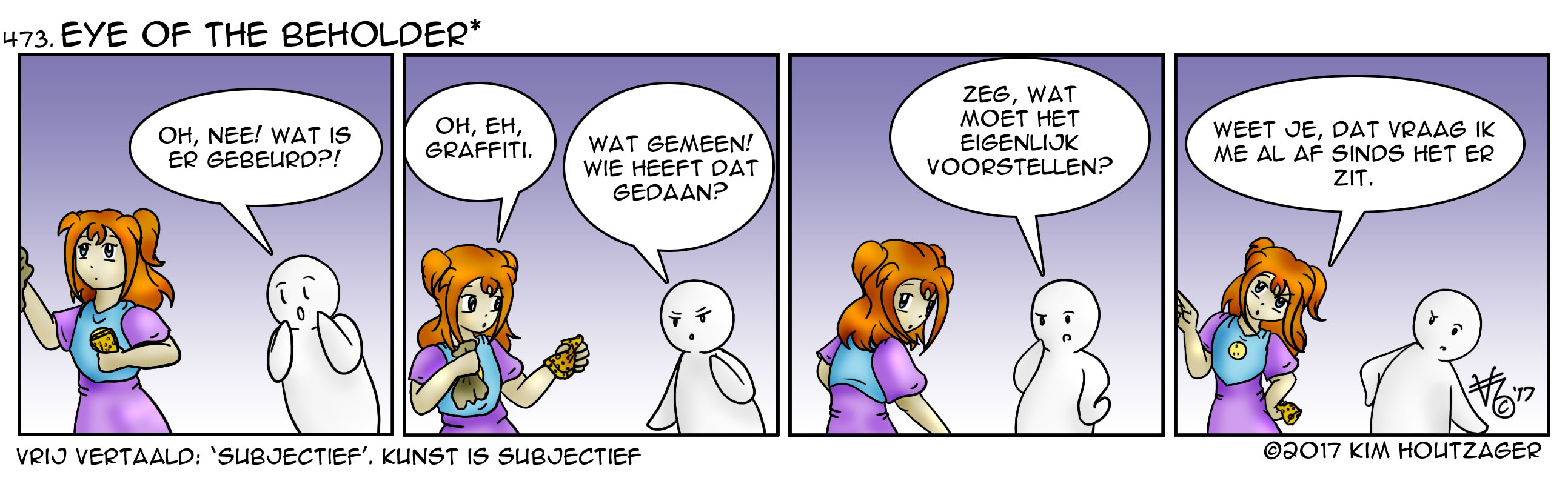 Kim: ‘Er zijn artiesten die niet kunnen wachten op de KunstGein Atelierroute (10 en 11 juni). Zo is er een artiest langsgegaan die vele elektriciteitshuisjes en deuren van zijn kunstwerken heeft voorzien. Het moet een hele opgave zijn geweest, zo veel deuren af te gaan om een krabbel op te zetten. Ik denk echter, dat ik niet genoeg snap van moderne kunst. Ik bedoel.. wat moest het voorstellen? In ieder geval had ik mijn weekend anders voorgesteld. Dat, en ik ontmoet graag de kunstenaar, zodat ik hem of haar complimenten kan geven voor zijn of haar prestatie.’