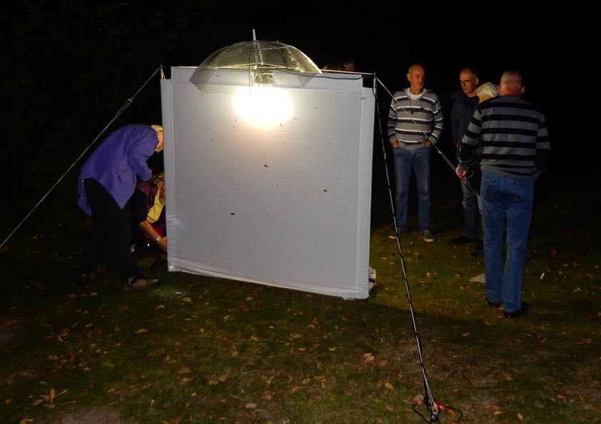 Kars Veiling van de Vlinderstichting: ‘Er was een wit laken gespannen met een felle lamp daarvoor. Nachtvlinders komen op het licht af en gaan zitten op het laken waarna ze op naam kunnen worden gebracht. Ook werd er gestroopt in het natuurkwartier! Stropen dan niet in de vorm van dieren doden, maar letterlijk stroop op bomen smeren. De stroop was speciaal bewerkt met veel extra suiker, appelmoes en de nodige alcoholica en bleek zeer aantrekkelijk voor nachtvlinders.’