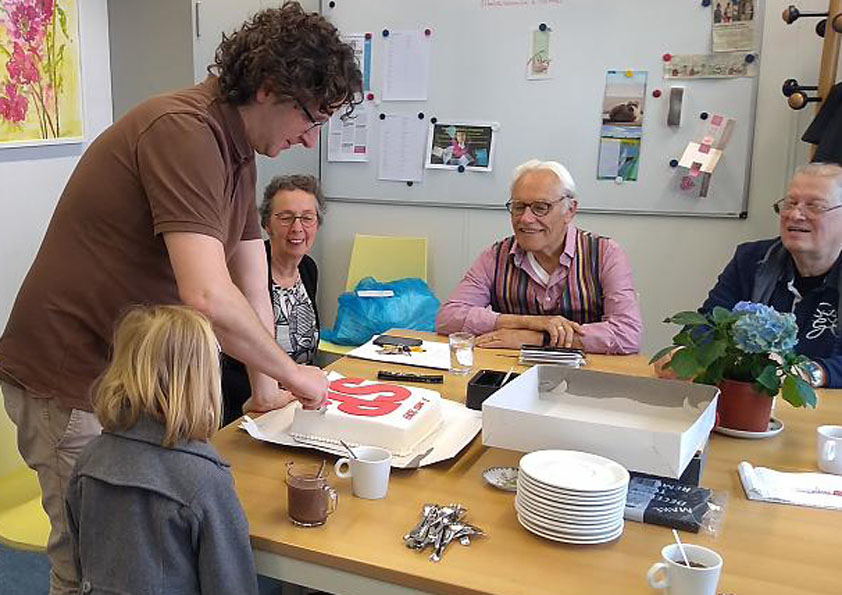 Fractievoorzitter Martijn Stekelenburg en bestuurslid Harry Kemper brachten de taart woensdagmorgen 1 mei jl. tijdens het werkoverleg op de Luifelstede. Hij werd goed ontvangen, en smaakte heerlijk! Martijn Stekelenburg ligt toe: ‘Op de dag van de arbeid huldigen we beroepsgroepen die een extraatje verdienen. De brandweer ging hen al voor, de mensen van Vluchtelingenwerk mogen zeker ook niet vergeten worden’!