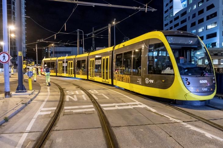 Foto: Testrit met de nieuwe tram bij halte Jaarbeursplein, Utrecht