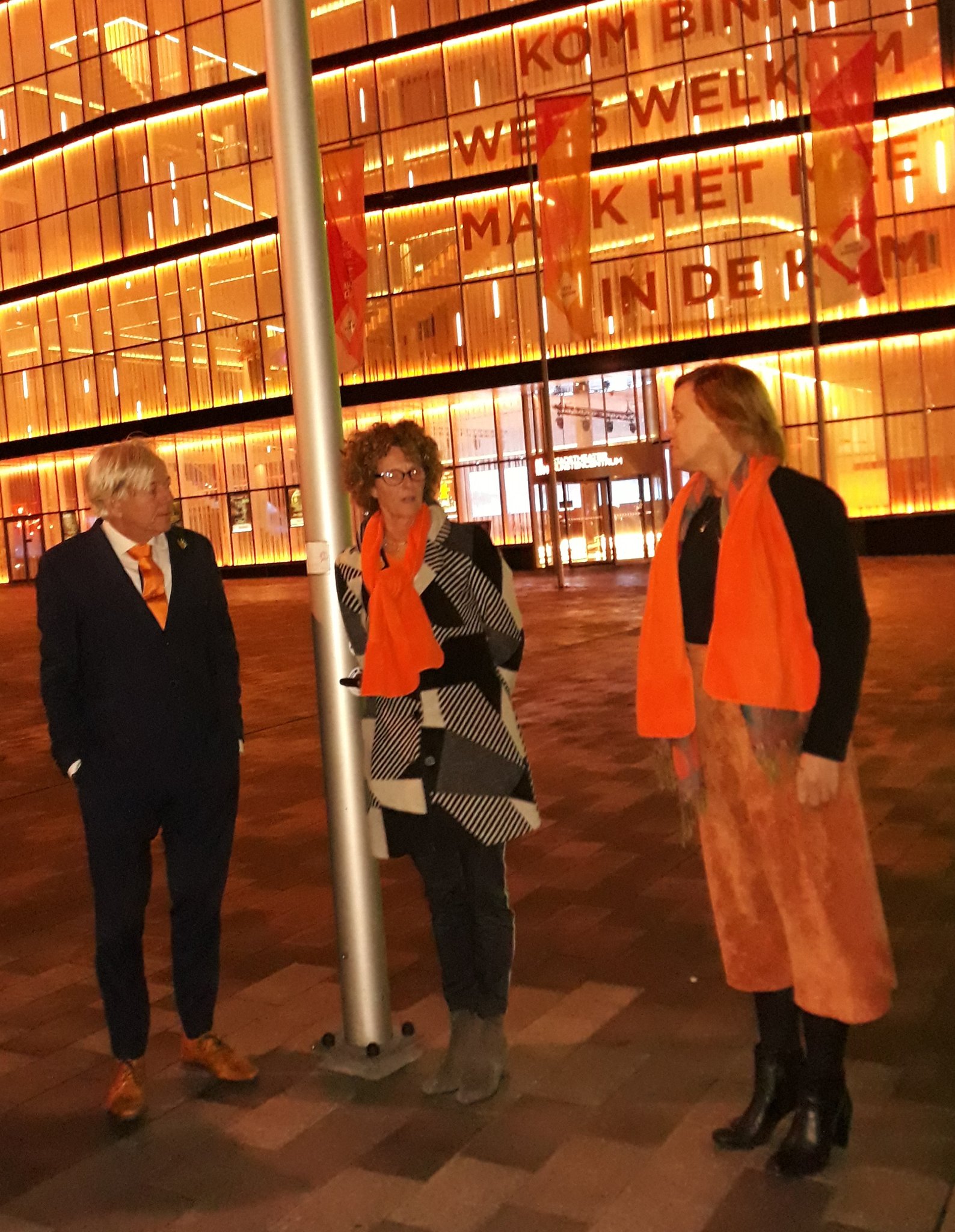DE KOM, Stadstheater en Kunstencentrum in Nieuwegein kleurt vanaf maandagmiddag 25 november oranje om aandacht te vragen voor de strijd tegen geweld jegens vrouwen. Nieuwegein doet mee aan de internationale campagne Orange the World. Het initiatief is onderdeel van de 16 Days of Action against Violence van de Verenigde Naties van 25 november tot en met 10 december, de Dag van de Rechten van de Mens. Wethouders Ellie Eggengoor, Marieke Schouten en Jan Kuiper hesen maandagmiddag om 17.30 uur de oranje vlag voor het theater.