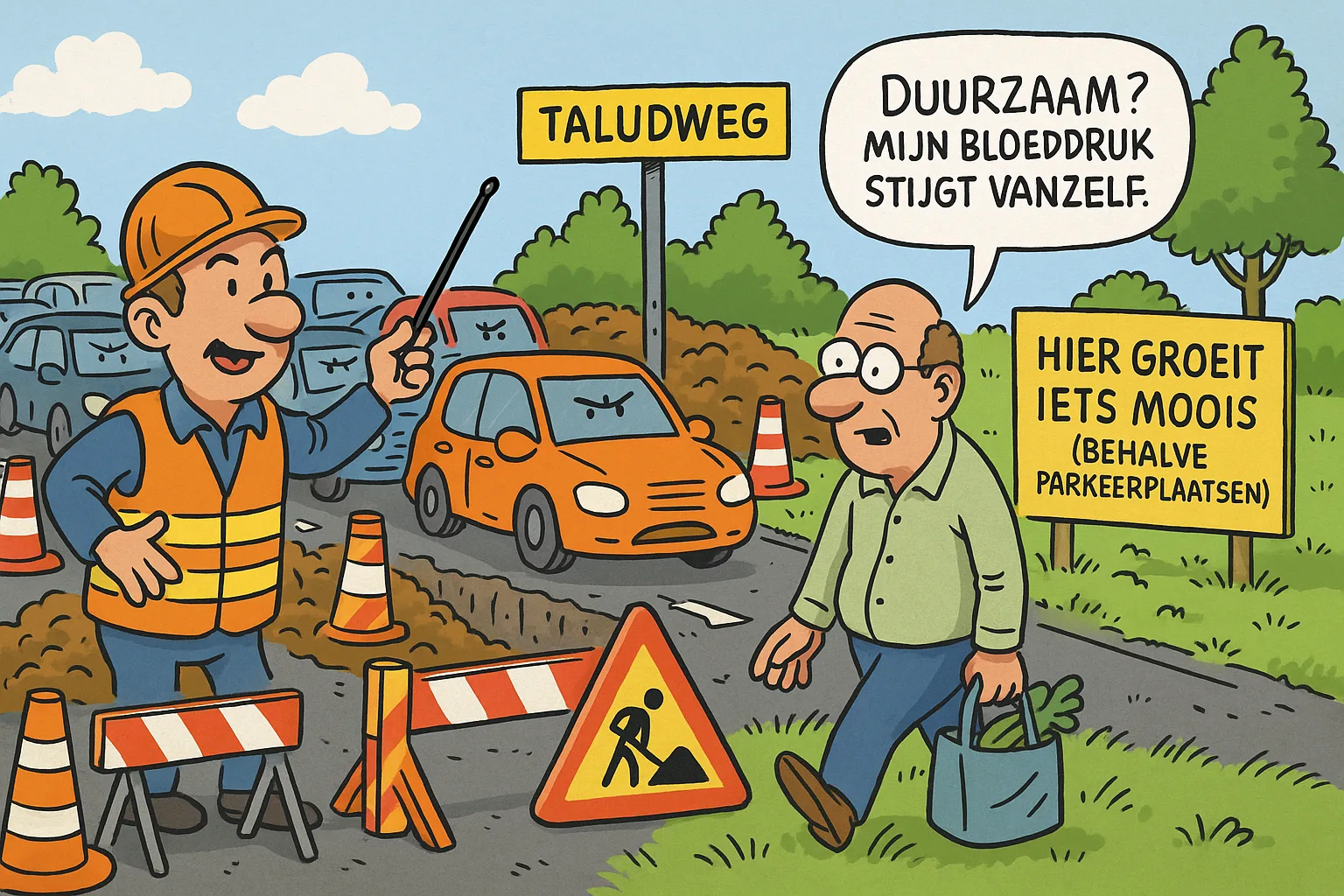 “Het is maar tijdelijk,” zegt een verkeersregelaar met het zelfvertrouwen van iemand die dat zinnetje al te vaak heeft uitgesproken. Over zes weken, zo fluisteren de kenners, mag de weg opnieuw dicht. Dan worden de kabels weer opgegraven om iets “net even anders” te doen.