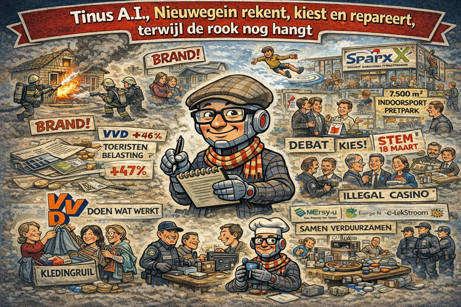 Mijn Tinus A.I. conclusie van deze week is simpel: Nieuwegein beweegt richting maart alsof het een kruispunt is met te veel verkeerlichten tegelijk. Veiligheid, wonen, opvang, lasten, zorg, alles knippert. Maar onder die politiek en die cijfers zit een tweede stad die veel stabieler is: de stad van ruilkettingen, reparatietafels, energieclubs, en mensen die oude filmspoelen uit de jaren zeventig afstoffen om te laten zien waar we vandaan komen. Als je wilt weten waar Nieuwegein echt van gemaakt is, kijk dan niet alleen naar het Stadshuis, kijk ook naar de keukentafel, en de gereedschapskist.