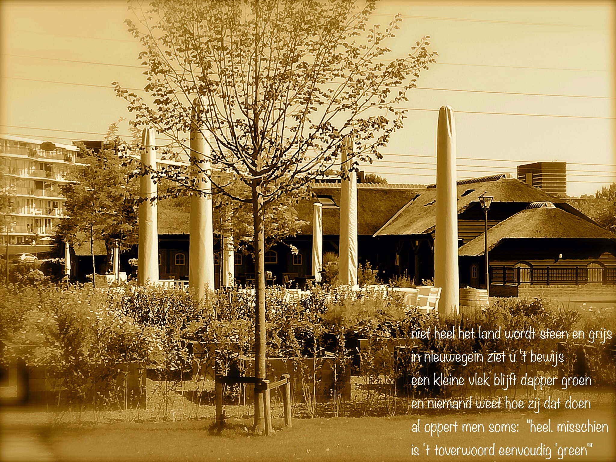 Ton: ‘laten we elkaar in nieuwegein bijstaan. dagelijks een beeld met gedicht. als we niet naar buiten kunnen, halen we buiten naar binnen toe. ik probeer in deze moeilijke tijd, deze blijf-thuis periode een beeldverslag te maken van mijn fietsrondje. een keer wat anders voor de lezers. natuurlijk wel met een gedicht.’