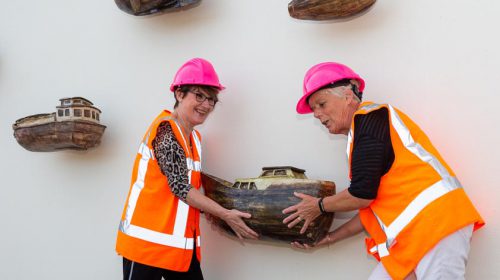 Veel Vreeswijkers en schippers kennen het: het kunstwerk met de 20 scheepjes dat aan de pilaar van de loopbrug naar de oude bedienruimte van de Prinses Beatrixsluis hing. De pilaar werd gesloopt, maar het kunstwerk kreeg een tweede leven. Vandaag, 22 juli, werd het laatste keramieken scheepje door de twee kunstenaressen op zijn nieuwe plek aan de werkloods van het sluiscomplex gehangen.