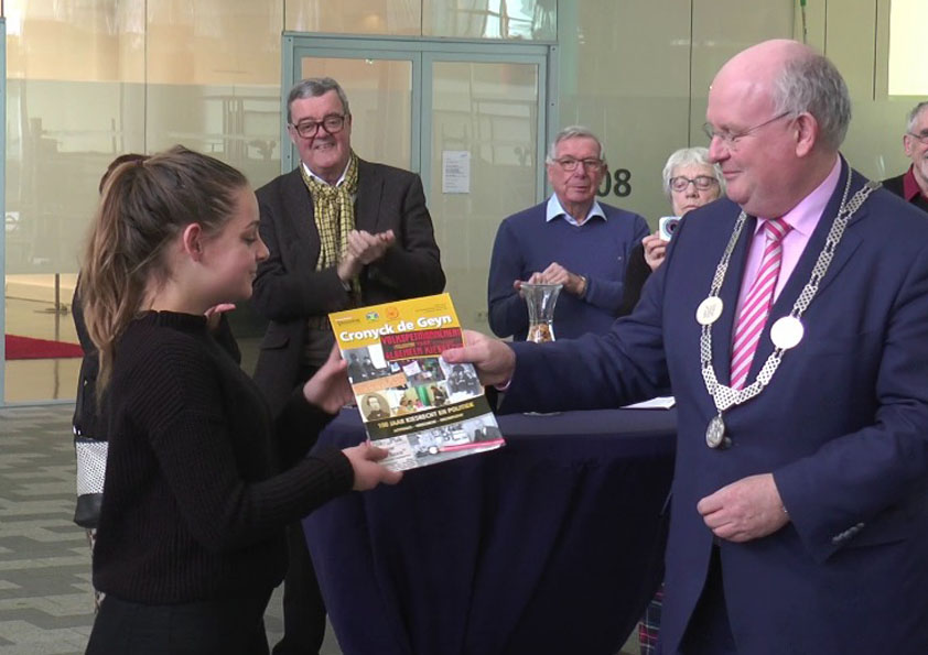 Onder zeer grote belangstelling werd afgelopen vrijdag de tentoonstelling ‘100 jaar kiesrecht en politiek in Jutphaas-Vreeswijk-Nieuwegein’ geopend. Na de introductie door Hidde van de Kluit, voorzitter van de Historische Kring Nieuwegein, ontving burgemeester Frans Backhuijs uit handen van de dertienjarige, politiek geëngageerde Josephine Lely 33 exemplaren van het speciale themanummer van Cronyck de Geyn, één voor elk van de raadsleden!