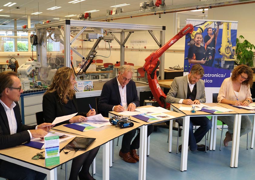 ROC Midden Nederland (ROCMN) en de voortgezet onderwijsscholen (VO) Cals College IJsselstein, Globe College, Oosterlicht College en Trajectum College hebben afgelopen vrijdag 31 augustus hun handtekening gezet voor een unieke samenwerking. Het betreft de gezamenlijke uitvoering van het technische vmbo keuzevak ‘Robotica’ op de Tech Campus in Nieuwegein.