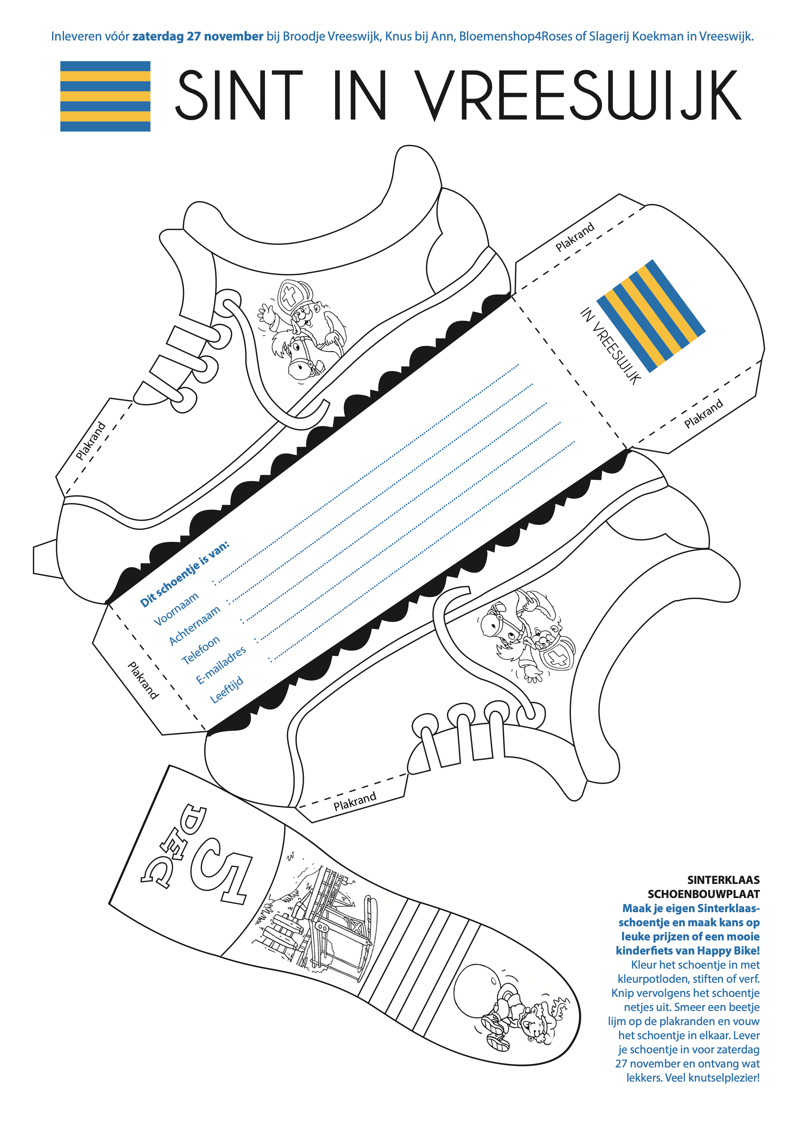 Maak je eigen Sinterklaasschoentje en maak kans op leuke prijzen of een mooie kinderfiets van Happy Bike! Kleur het schoentje in met kleurpotloden, stiften of verf. Knip vervolgens het schoentje netjes uit. Smeer een beetje lijm op de plakranden en vouw het schoentje in elkaar. Lever je schoentje in vóór zaterdag 27 november en ontvang wat lekkers! Veel knutselplezier!
