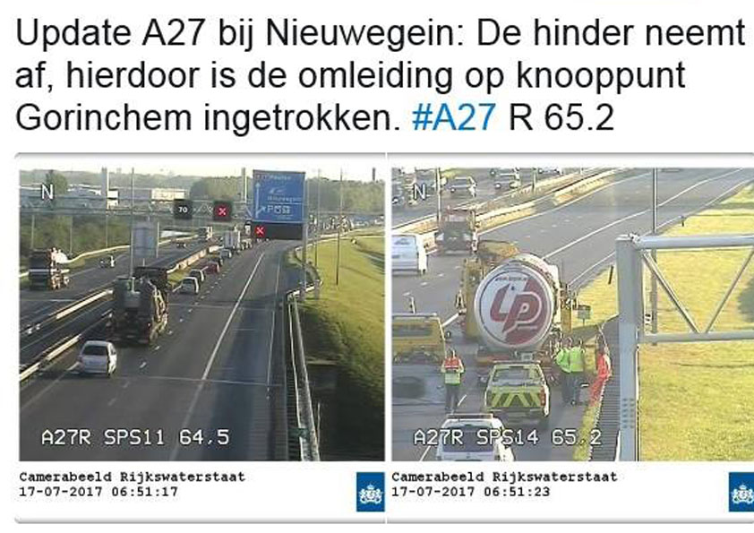 De tankauto zal geborgen worden door een bergingsbedrijf. Tijdens deze werkzaamheden zullen twee rijstroken gesloten blijven. Tot hoe laat de bergingswerkzaamheden is onbekend. Verwacht wordt dat rond 08.00 uur de weg geheel vrij kan worden gegeven.