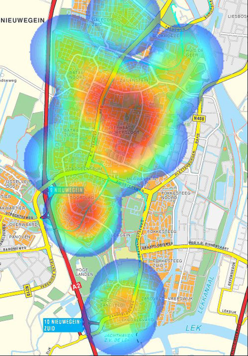 Op onderstaand kaartje, die de politie van Nieuwegein heeft vrijgegeven, ziet u de inbraken. Hoe roder het gebied is gekleurd, hoe meer inbraken er zijn geweest de afgelopen vier weken.