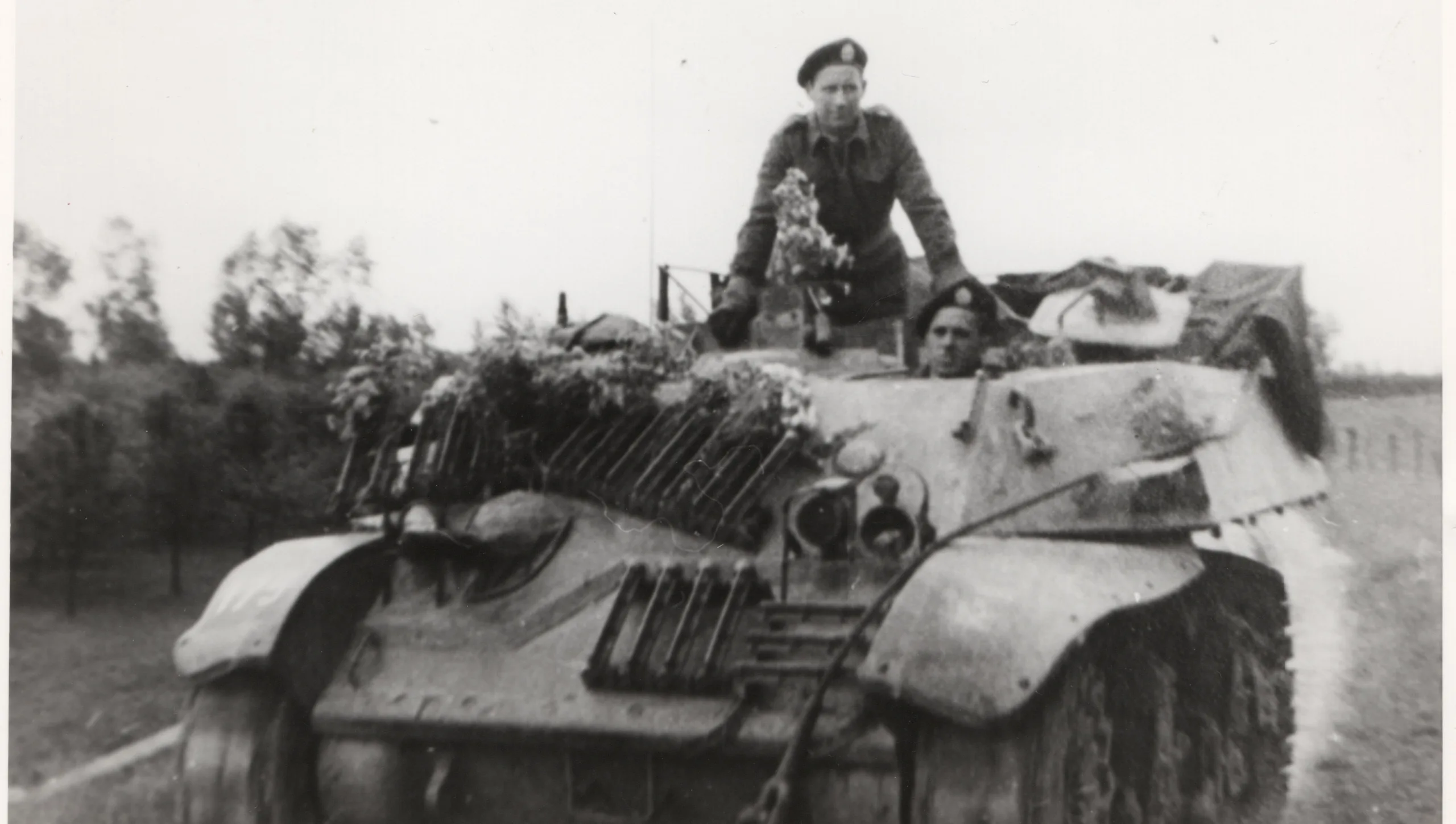 De bevrijders naderen Vreeswijk in hun met bloemen versierde tanks. Foto: Coll. Van Zutphen
