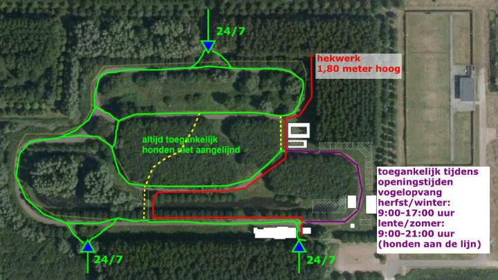 Bijgaande afbeelding geeft in groen de bestaande verharde paden aan die 24/7 (24 uur per dag & 7 dagen per week) toegankelijk blijven. De geel gestippelde paden zijn bestaande of nieuwe paden, die door de gemeente goed begaanbaar gemaakt worden (zonder verharding). Het paars aangegeven deel van het verharde pad zal alleen toegankelijk zijn tijdens de openingsuren van de vogelopvang. Honden moeten daar aangelijnd. In rood is het verloop aangegeven van het hekwerk dat geplaatst zal worden om de locatie van de vogelopvang. Het gebied buiten deze hekken zal de functie behouden van hondenlosloopgebied. In het wit zijn de gebouwen en volières van de vogelopvang ingetekend.