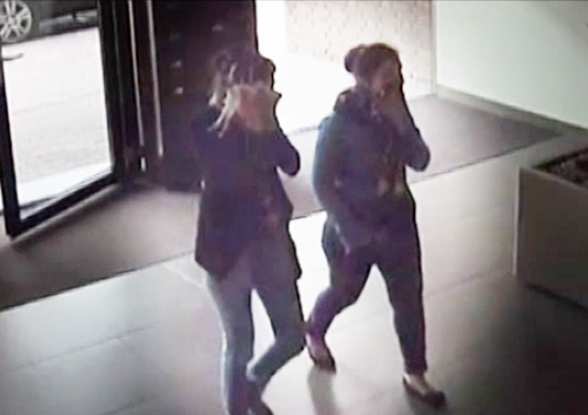 Op bewakingsbeelden zien we twee vrouwen aan komen lopen. Het is dan rond 16.40 uur. Als ze bij de ingang van het appartementencomplex zijn proberen ze de deur open te krijgen. Op de één of andere manier lukt dat, vermoedelijk met flipperen. Dan lopen ze naar binnen en bedekken hun gezicht.