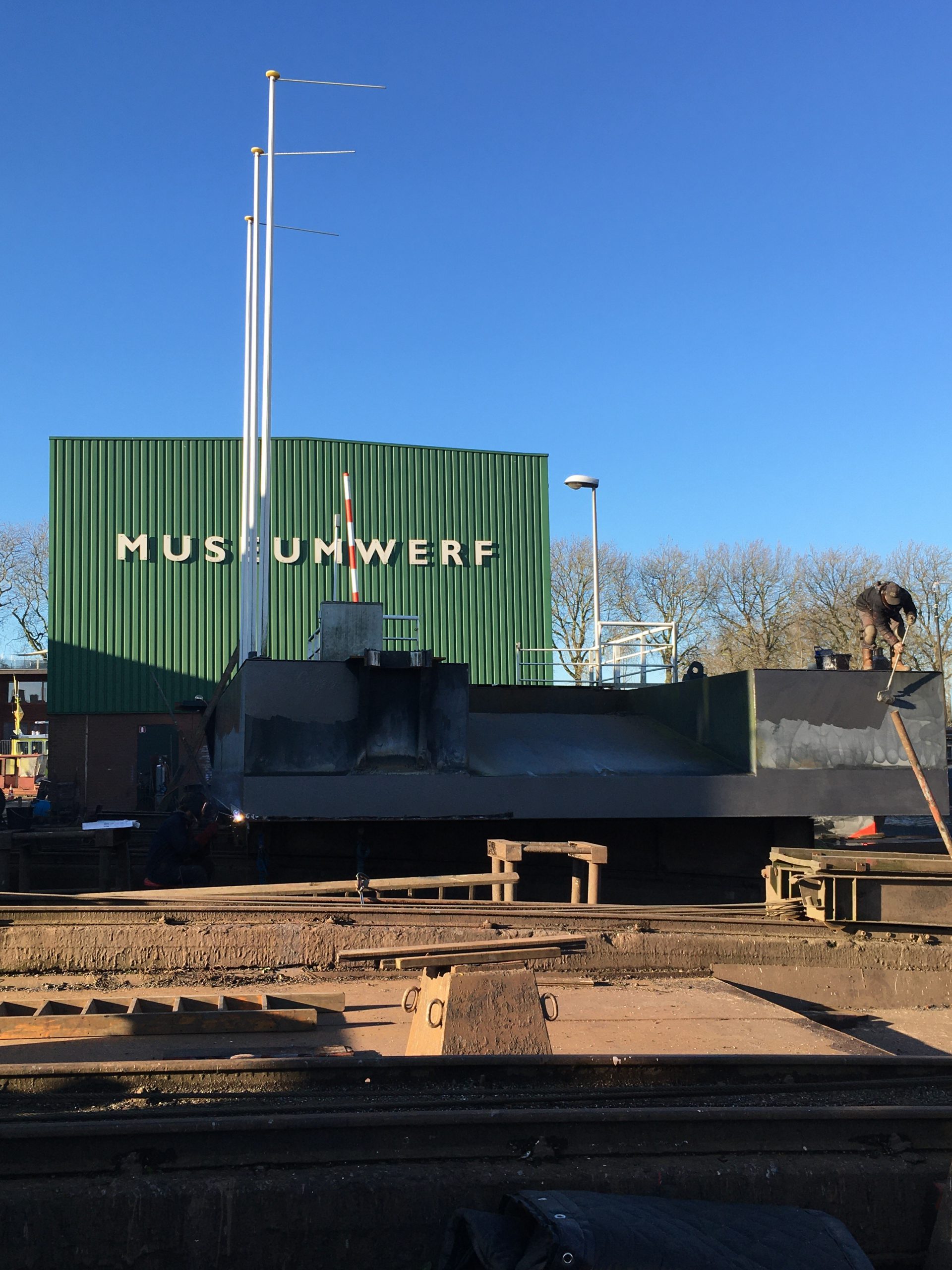 De weergoden zijn de Museumwerf gunstig gezind. Er schijnt een vriendelijk zonnetje en wind is er ook nauwelijks. Zo kan er goed worden doorgewerkt aan het afmeerponton van de Veerpont Vrevia dat nu op de helling staat. Het werk vordert gestaag.