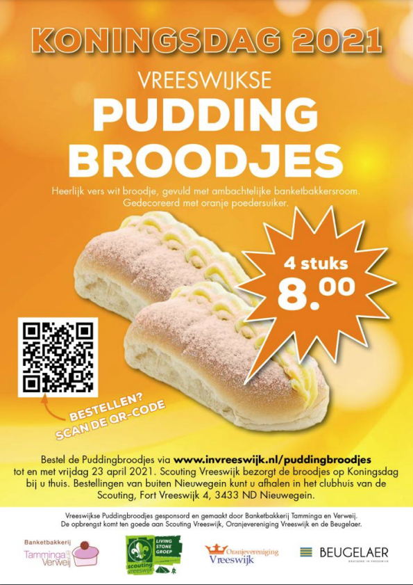 Diverse ondernemers en instellingen zijn een leuke puddingbroodjes actie begonnen. De opbrengst gaat naar diverse lokale instellingen. De puddingbroodjes worden gemaakt en gesponsord door Banketbakkerij Tamminga en Verweij. Leden van Scouting Vreeswijk bezorgen de broodjes op Koningsdag bij u thuis als u binnen Nieuwegein woont. Bestellingen van buiten Nieuwegein kunnen opgehaald worden bij het clubhuis van Scouting Vreeswijk, Fort Vreeswijk 4, 3433 ZZ Nieuwegein.