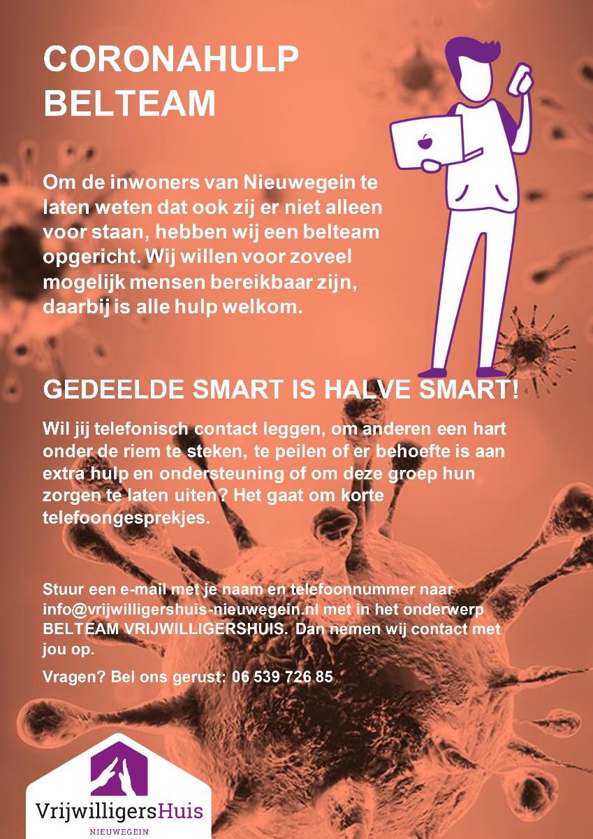 Het Coronavirus raakt ons allemaal en niemand kan het negeren. Dat betekent tegelijkertijd dat we er met zijn allen, van alles aan doen om het zo draaglijk mogelijk te maken. En dan vooral voor de mensen die het extra moeilijk hebben in deze tijd. Om die reden ondersteund het Vrijwilligershuis in Nieuwegein een belteam. Wil jij helpen? Laat het dan weten via info@vrijwilligershuis-nieuwegein.nl.