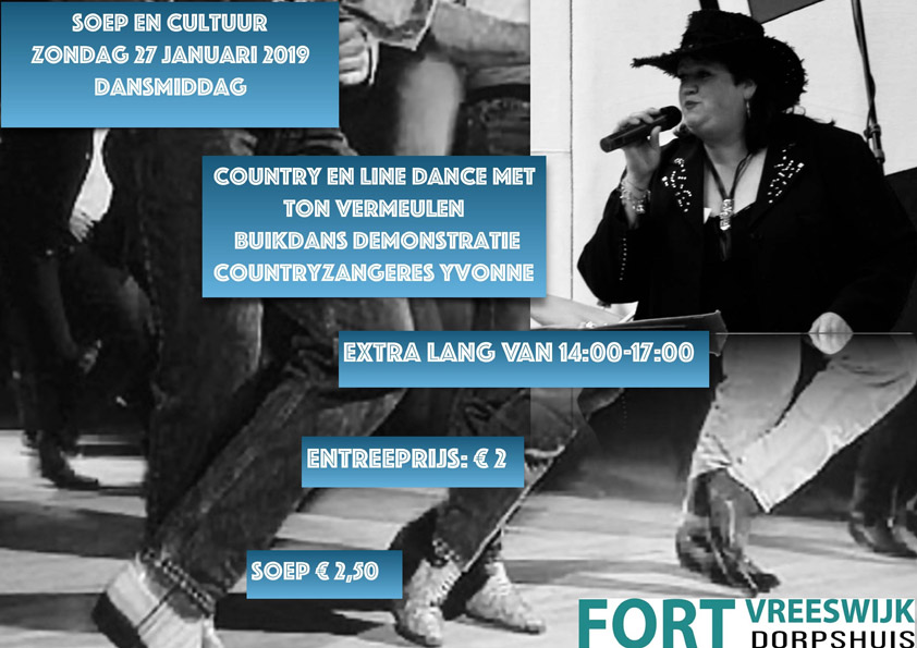27 januari zorgt Ton Vermeulen voor swingende muziek en geven de deelnemers van de Country Line Dance een demonstratie. Iedereen mag daaraan meedoen. Deze middag is van 14.00 uur tot 17.00 uur. De entree bedraagt € 2,- en tussendoor kunt u genieten van een heerlijke kop huisgemaakte soep á € 2,50. Meer informatie kunt u verkrijgen via Dorpshuis Fort Vreeswijk: 06-21664918.