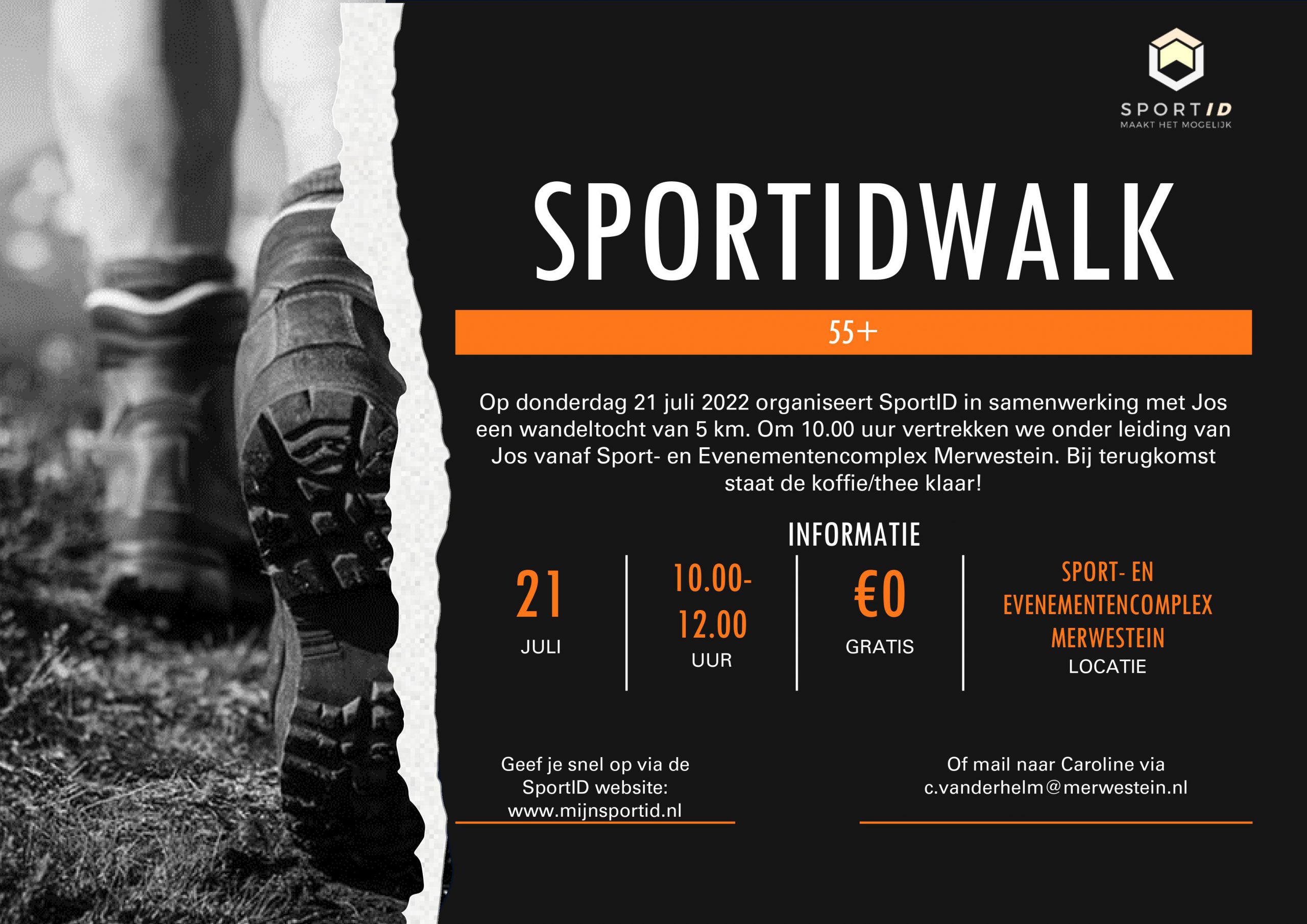 In de zomervakantie organiseren de buurtsportcoaches van SportID verschillende activiteiten voor jong en oud. Op donderdag 21 juli organiseert SportID voor 55-plussers een wandeltocht van 5 km. Om 10.00 uur vertrekken de deelnemers onder leiding van wandelaar Jos vanaf Sport- en Evenementencomplex Merwestein. Bij terugkomst staat de koffie/thee klaar!
