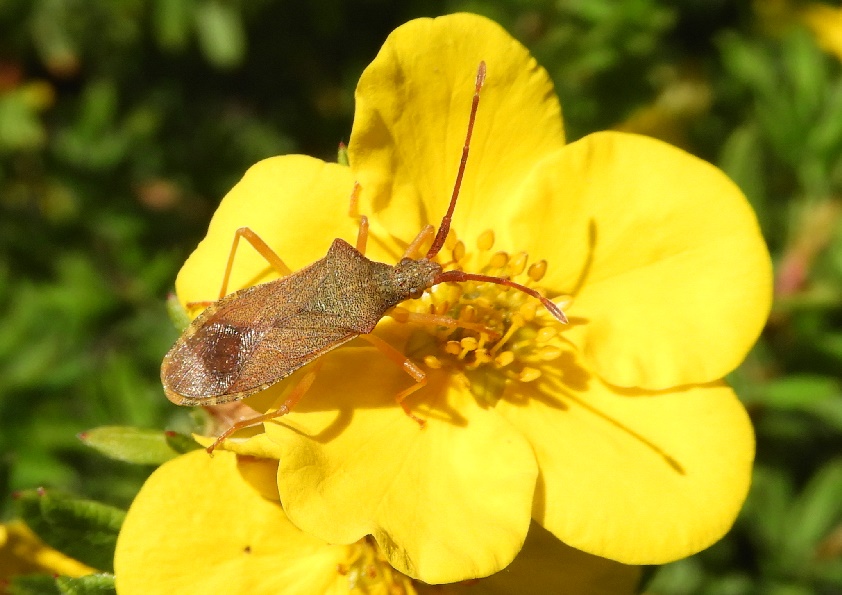 Udo: ‘In veel plantsoenen en tuinen staan kleine struikjes met veel gele bloempjes: de struikganzerik. Oorspronkelijk uit Zuid-Europa, maandenlang bloeiend, dat trekt enorm veel insecten. Ook allerlei wantsen, meestal piepklein maar er zijn ook grotere. Zoals de smalle randwants, een kanjer onder de wantsen. Ook uit Zuid-Europa.’