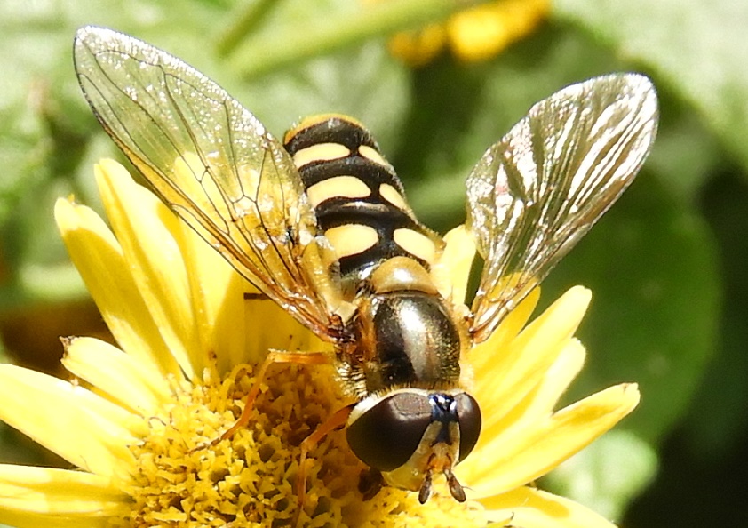 Udo: ‘Kommazweefvliegen hebben gele streepjes met een bolletje op hun bruin of zwarte achterlijf. Mooie vliegjes, die vaker in een bloementuin dan ergens anders te zien zijn. Dat gaat soms door tot in oktober, als het wat langer nazomert. Daarvan nu één van de grotere, de boogkommazweefvlieg.’