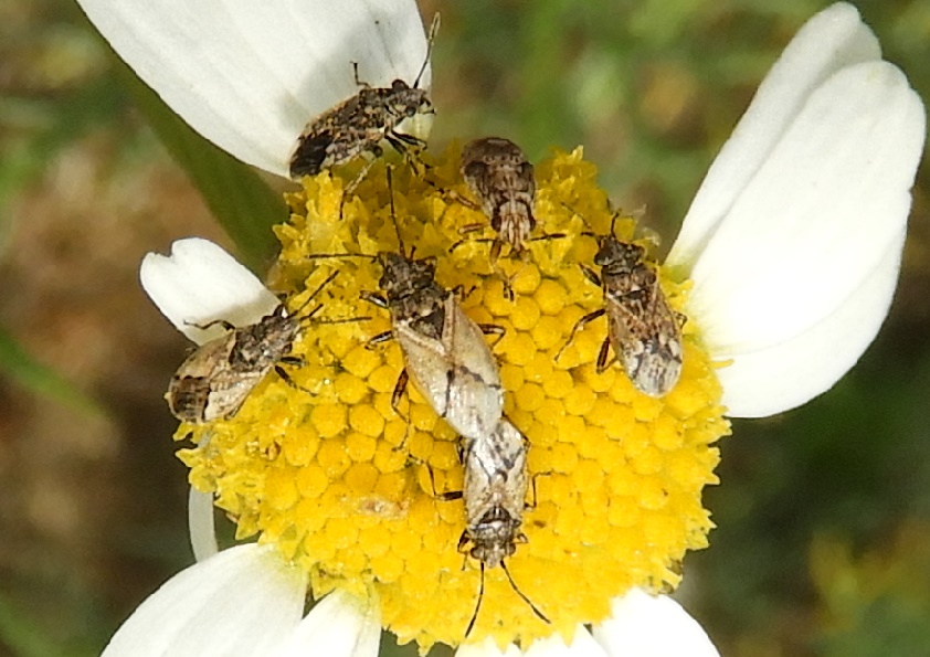 Udo: ‘De Bossenwaard stond in augustus in volle bloei, ondanks de droogte. Op de talrijke reukeloze kamille krieuwelden piepkleine grondwantsjes, waarschijnlijk composietennysirusjes. Ze bouwden kennelijk een feestje, en vielen op door de lichtgeel en wit gekleurde bloemen waarop de happening plaatsvond. Er zijn 7 soorten van deze familie Nysirus in Nederland gevonden, en ze lijken allemaal sterk op elkaar ongeacht waar ze ooit vandaan zijn gekomen.‘