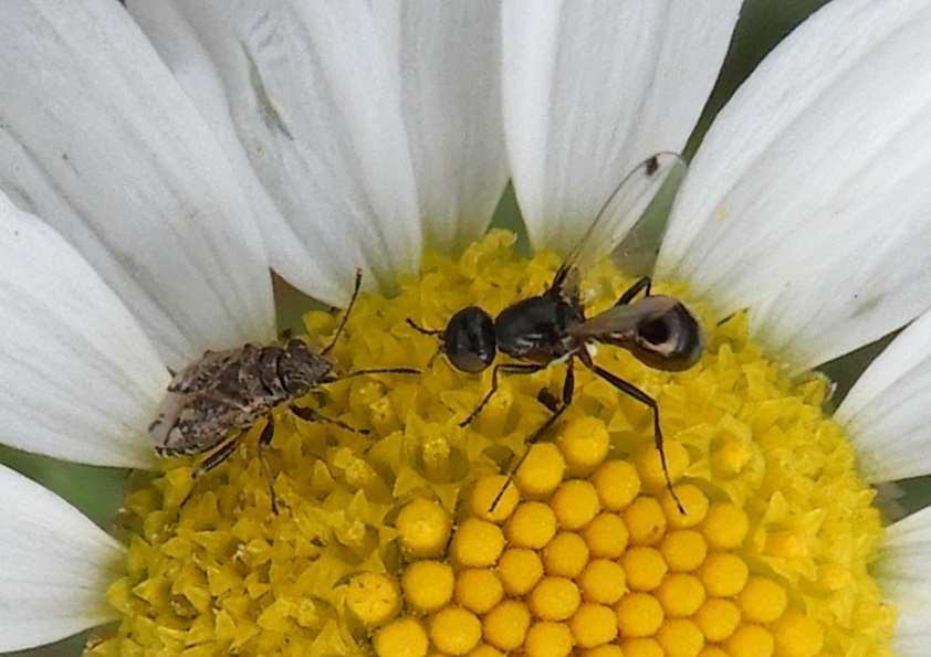 Udo: ‘Als twee “grote” insecten het op dezelfde bloem voorzien hebben om van de nectar te snoepen, geven ze elkaar vaak een duwtje. Zo van: “wegwezen”. Maar van de kleine insecten gaan er soms wel 10 op een kamillebloempje, en zijn ze van dezelfde soort dan is dat geen probleem. Ongelijksoortig maar één groot en de ander klein: meestal geen probleem, tenzij de kleinste zich bedreigd voelt. Allebei heel klein? Daar maak ik van: “Hééé! wat doe jij op mijn kamille?”‘