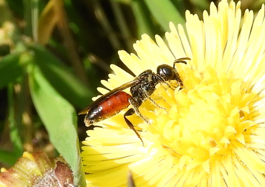 Bij de Foto: ‘Als je hoort dat veel parasitaire bijen van de familie bloedbij zijn, dan vraag je je meteen af of of ze ook op mensen parasiteren. Nee! Ze heten bloedbij omdat de meesten een ten dele knalrood achterlijf hebben en dat komt ook voor bij sommige andere families. Ze parasiteren op andere bijen door de verzorging van hun kroost aan die anderen over te laten. Zoals deze schoffelbloedbij.‘