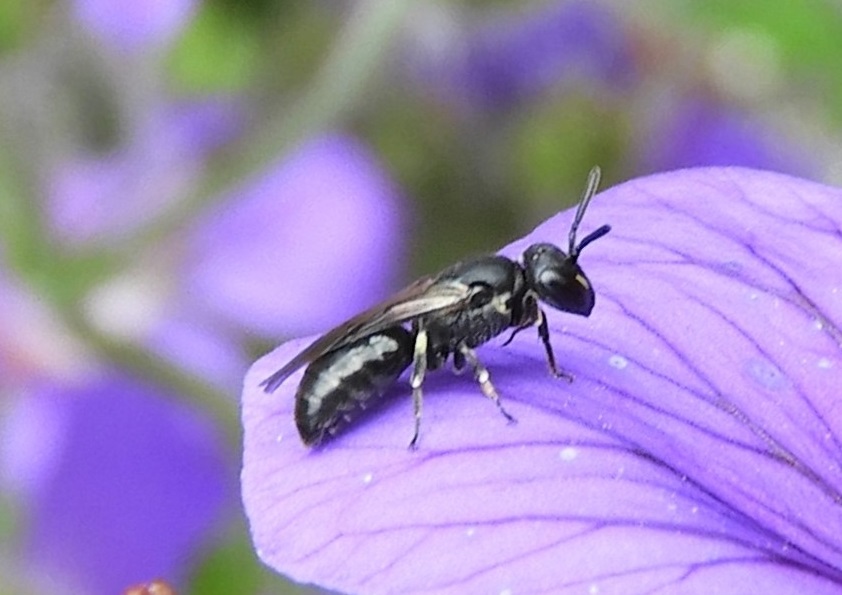 Udo: ‘Klokjesbijen zijn vrij kleine, zwarte bijen die gespecialiseerd zijn op klokjesbloemen. Maar ook op ooievaarsbekken in de tuin komen ze aan hun trekken, omdat de bloemen ongeveer dezelfde vorm hebben en soms ook de kleur. Dus als je een zwart bijtje ziet op een blauwe ooievaarsbek, dan is het…, een maskerbij.’