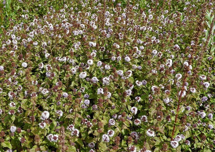 Bij de foto: ‘Niet iedereen heeft waardering voor de sterke geur van watermunt. Voor hen zijn er nog veel andere muntsoorten in Nieuwegein. Ook heel mooi, met lila of witte bloemen, nooit zoveel en zonder die sterke geur. Daarvan heeft hertsmunt zelfs nauwelijks een (munt)geur. In de Bossenwaard vormt watermunt hele veldjes, geurige veldjes dus. Zoals deze.’